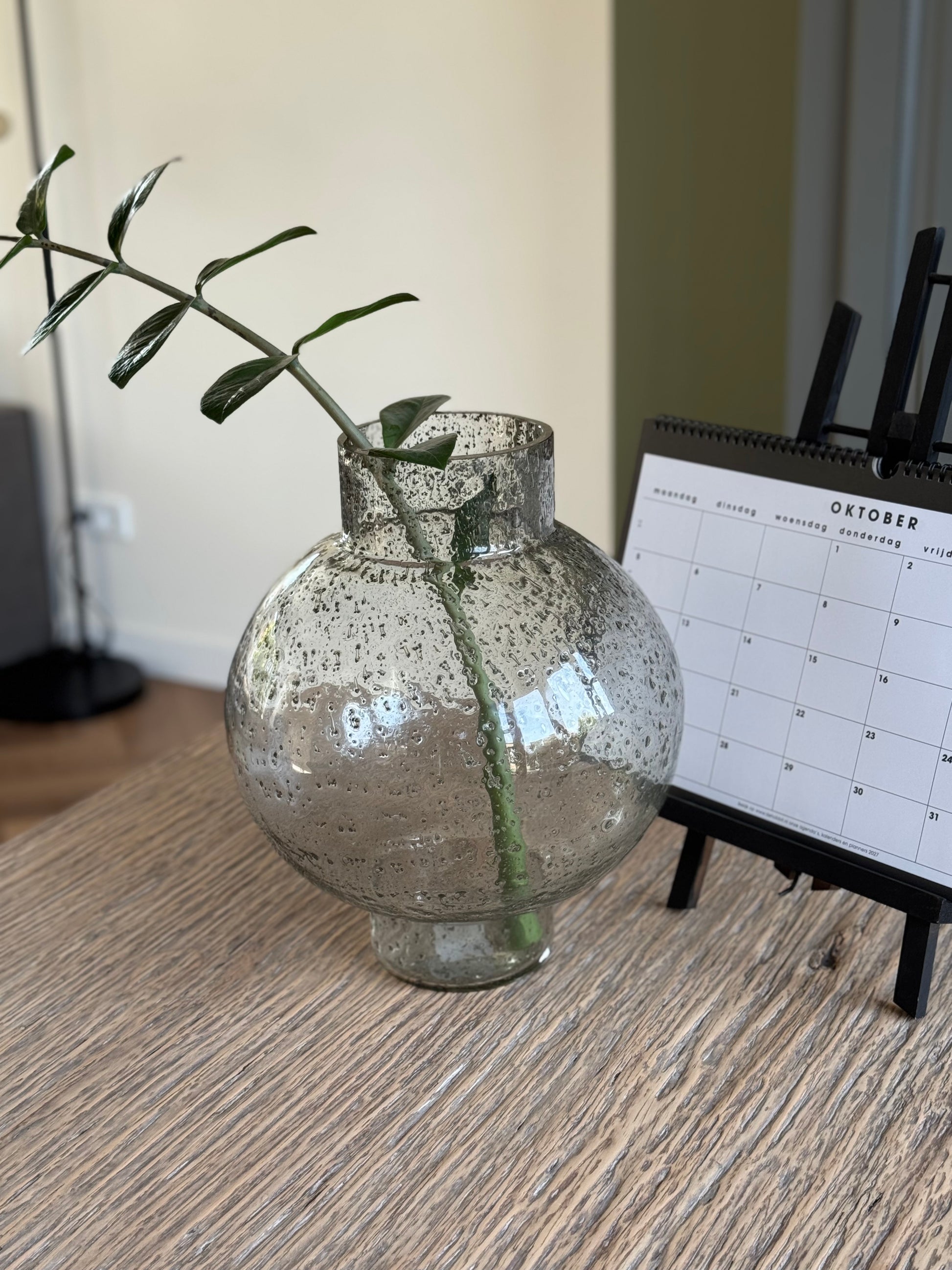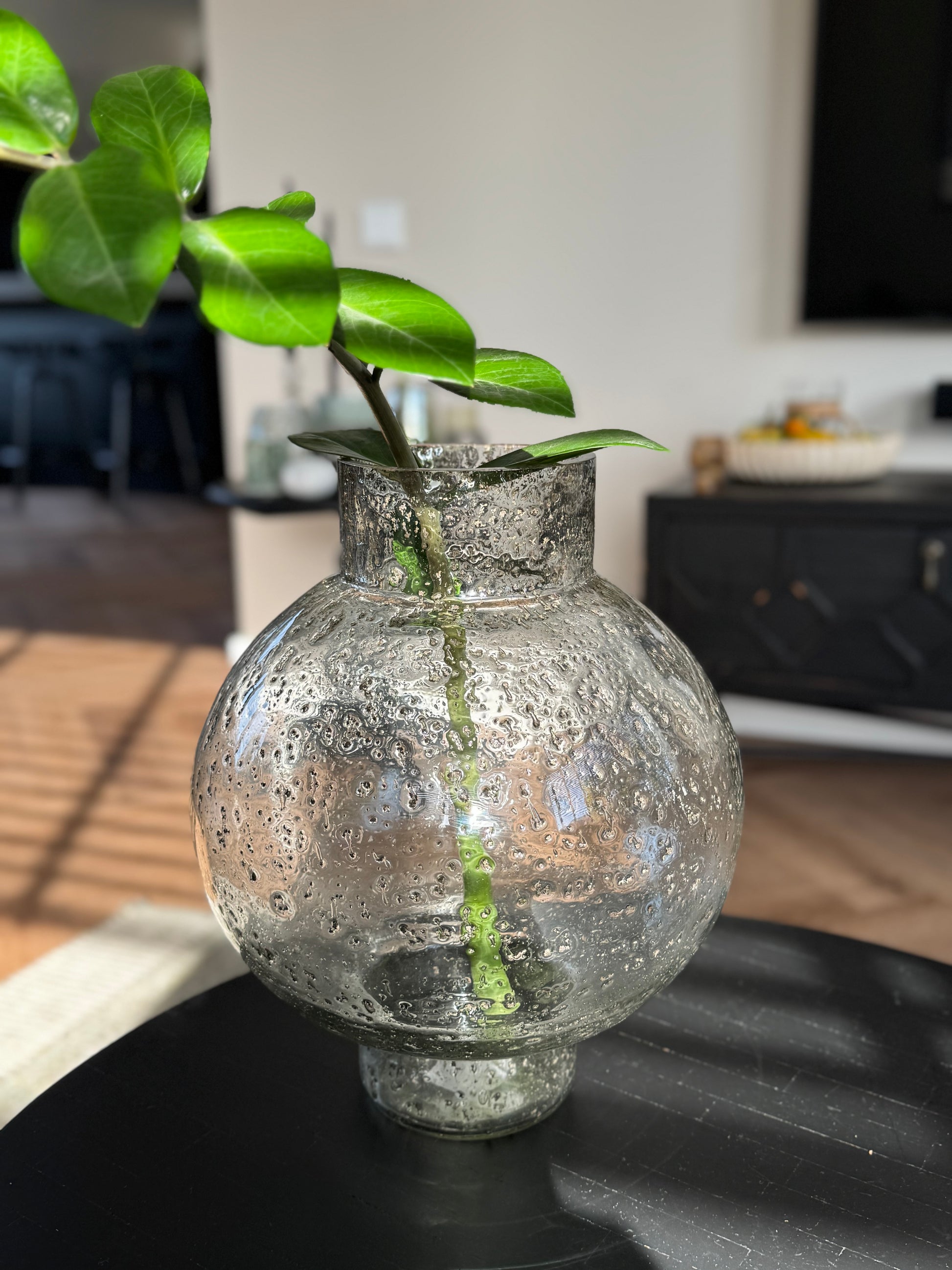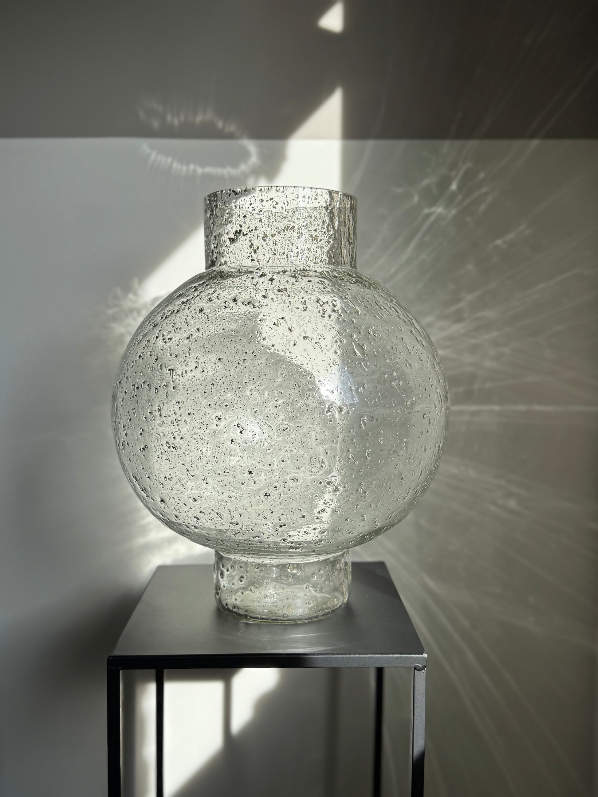 Wat een parel! Deze bolvaas van stevig glas is er eentje waar je meteen blij van wordt. Het glas is mega dik en van topkwaliteit, met prachtige spikkels die in het licht tot leven komen.