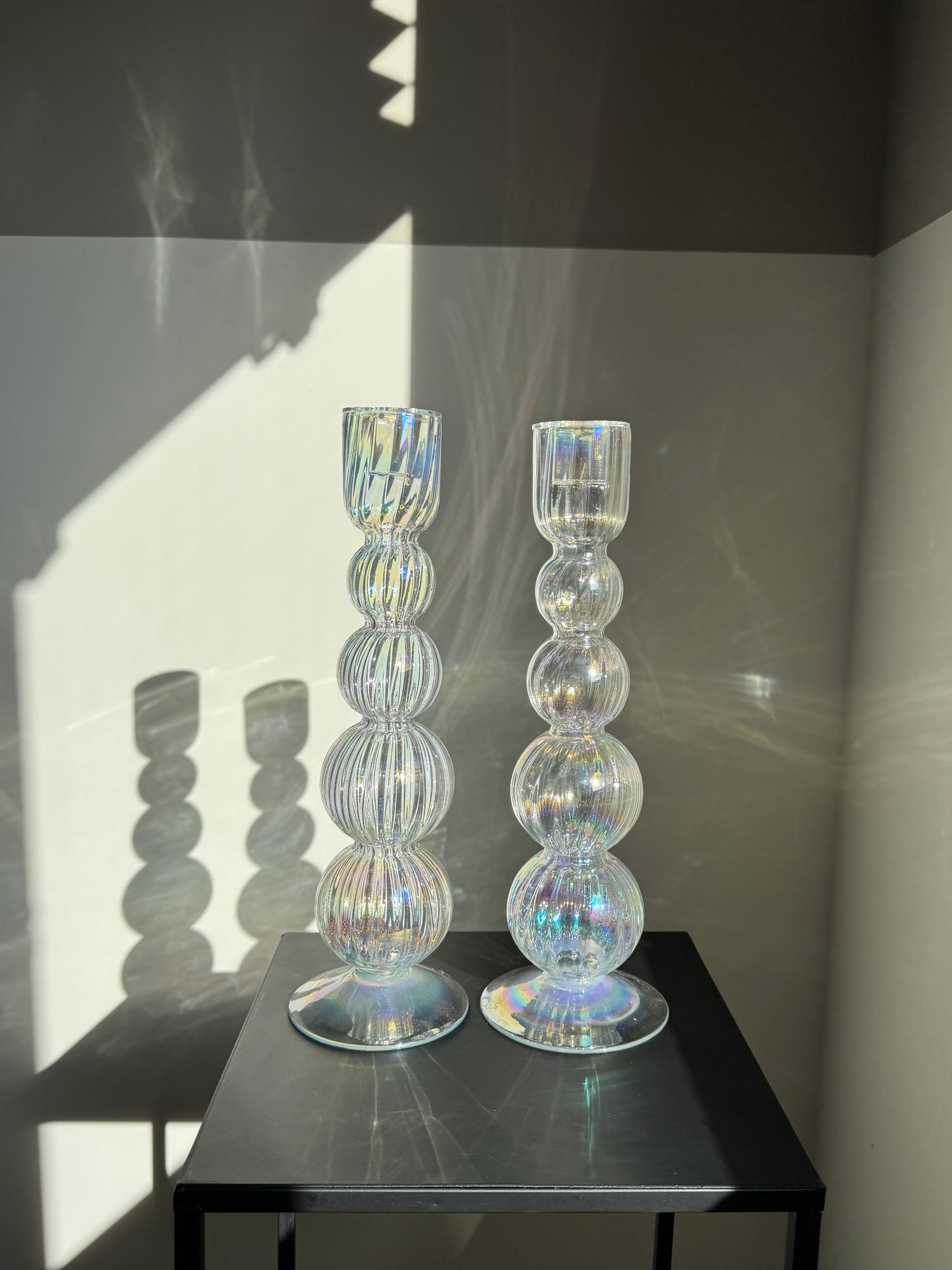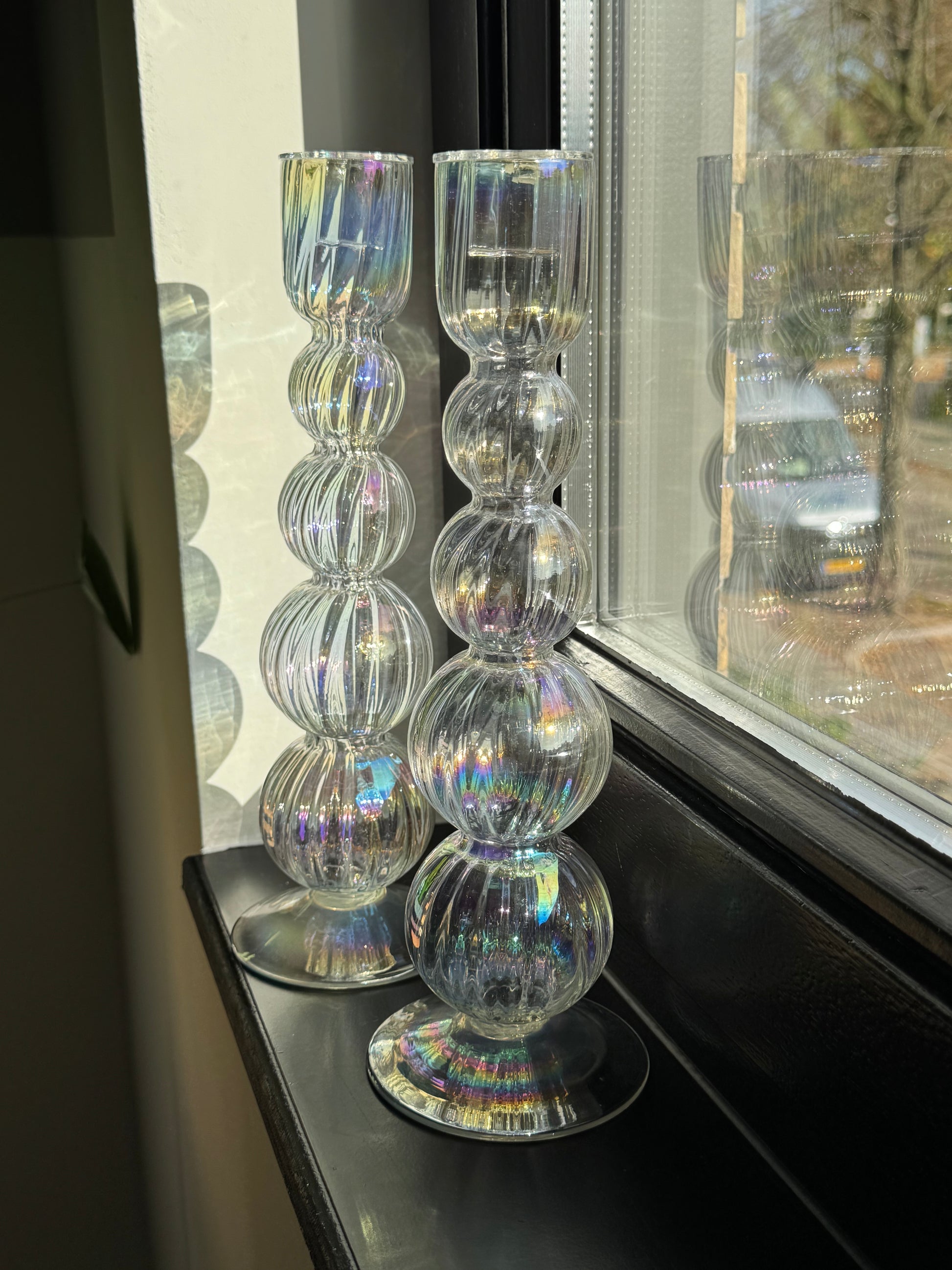 Breng sfeer en elegantie in huis met deze prachtige glazen kandelaar. De parelmoer glans vangt het licht op een betoverende manier, terwijl de bolletjes structuur zorgt voor een speels en stijlvol effect.